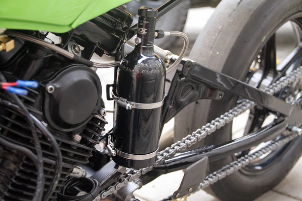 A minták nélküli sík profilú drag gumi és a nitrós palack árulkodó, sejteni lehet, hogy nem közértbe járáshoz reszelgeti már vagy két éve az öreg Yamahát.