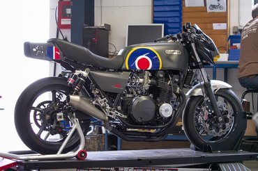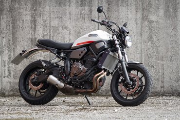 Ottjártamkor párhuzamosan dolgoztak egy 30 éves Z1-es Kawasakin és egy nulla kilométeres Triumph Thruxton R-en, míg a polcok mellett ott állt egy endurósításra váró SR400 és egy Paul Smart idomos Ducati Sport Classic 1000 – bárhová néztem, csupa érdekességet láttam, lecsupaszított Yamaha TRX850-től kezdve az MV Agusta F3-ig. Nagyjából ennél a pontnál futott be főnök az XSR700-zal, egészen pontosan az XSR700 projektmotorral, amit aztán el is vihettem egy körre.