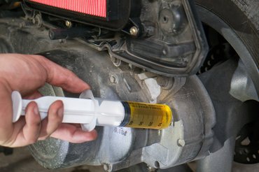 A hajtóműolajnál valamivel nehezebb a dolog, mivel a 0,18 liter pontosabb mérést igényel. Ráadásul egy vízszintes irányú betöltőnyílást alakítottak ki. A problémát egy 130 forintos műanyag fecskendővel oldottam meg. A fecskendő fél decis, azaz három teljes töltet, meg még 0,3 deci, és kész.