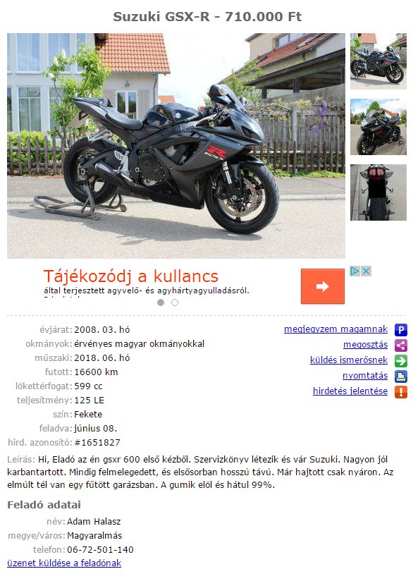 Az egyik egy 2009-es Suzuki GSX-R1000 egy milláért, 11 ezer kilométerrel - tuti bolt, az ilyesmit egyébként két és félszer ennyiért szokás kínálni. Ami túl szép, hogy igaz legyen, az általában nem igaz, ahogy ez sem: a telefonszám kamu, a képek pedig egy német hirdetésből származnak. A hozzá tartozó szöveg is olyan, amilyen, de mivel rendszeresen kapok analfabéta olvasóktól levelet, én már teljesen hozzászoktam ehhez a fogalmazásmódhoz.