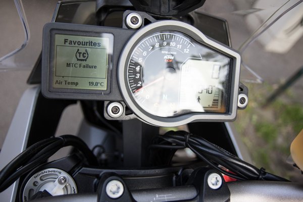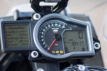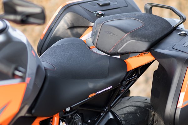 A KTM Super Duke R elektronikus okosságai mellett, mint amilyen a gyorsváltó, a visszaváltásokat felügyelő MSR, az üzemmódkapcsoló, a kipörgésgátló és a csúszókuplung, megkapta a 1290 Super Adventure jóságait is, a kanyar ABS-t, a LED-es kanyarfényszórót, az automatikusan lekapcsoló indexet, a guminyomás figyelőt és a Hill Hold Controlt, ami meredek emelkedőn indulva megfogja a motort, hogy ne guruljon vissza. A tesztmotorra ezeken felül még került ülés- és markolatfűtés is, ezekből az utóbbi a necces, ugyanis a markolat nagyon lágy anyagból készült, olyasmi, mint az sportendurókon, vagyis szinte ragad a tenyérbe, cserébe viszont gyorsan is fog kopni – tízezres szervizre már nem lesz rajta minta.