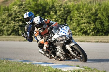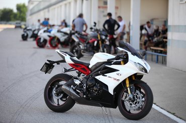 Néhány héttel később aztán egy verőfényes júniusi délutánon végre a sorhármasok vonyítása töltötte be a pályát. Új Speed Triple R-ből rögtön kettő, három első generációs Daytona 675 és három aktuális R változat, az egyik ráadásul Chrobák Jani ex versenymotorja. Jelenleg éppen az ifjabbik Greksa Attila vitézkedik vele a magyar bajnokságban, az idősebbik jóvoltából pedig ki is próbálhattam. A reszelt szupersport blokk versenybenzinnel megy, már az alapjárata is sokkal idegesebb a szériánál. Rettentően forog, cefetül tapad, és már gondolatra is irányt vált. Azonban nem vagyok azon a szinten, hogy ezt a hegyes technikát néhány kör alatt ki tudjam élvezni, a széria R változattal jobban éreztem magam. A kézen állós versenymotorról visszaülve rémületes élmény volt a mély és keskeny kormánycsutkák után a saját, magas és széles kormányommal körbetalálni.