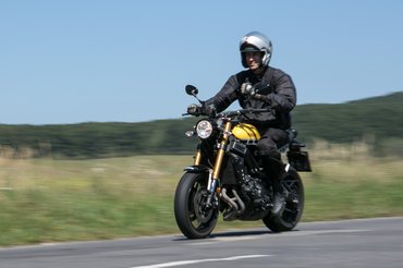 Egy fekete, egyenes kormány mered előtted keresztben, kis, kerek – sajnos digitális – műszerfal, hátrahúzod a startkapcsolót és... alapjáraton semmi. Szépen jár, aztán kis gázra kezdődik a műsor, az a műsor, amit csak háromhengeres blokk képes előadni, az a műsor, amiért mezítláb, egy szál gatyában, egy fej hagymával a zsebemben elmegyek bárhová, pedig még el sem indultam a motorral. Na, ami eztán jött, az 18-as karikás. Vad, küzdős, borzongással, meglepetéssel, váratlan húzásokkal és igazi gyönyörrel teli szex, akarom mondani, motorozás. Kipörgésgátló off, gázreakció-választó A-módba, s megyek Iván Duke-jának nyomában. Fordított első villa és állítható futóművek ide vagy oda, ez az utcagyerek nem pontos, nem fegyelmezett és nem szolgálatkész, ide-oda megy, mocorog elöl-hátul, ha húzod neki, tör ki a fara, kanyarban nagyjából tartja az ívet, de mindez nem számít, mert olyan, mint aki ilyen akar lenni, ilyen a személyisége, az egyedi stílusával varázsol, a váratlan húzásaival inspirál, odaadóan rádmászik, kihozza belőled az ősi ösztöneidet, felszínre hozza benned a harcost és a hőst.