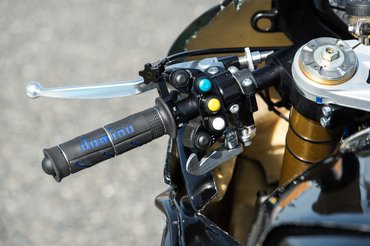 Ez nem adott sok önbizalmat, ráadásul a hátsó kis bukkanón kigyorsítva rohadtul táncolt a kormány a kezemben. Max gyakorlatilag bezuhan a kanyarokba, az én tempómmal viszont a motor esetlenül billegett a kanyarbejáratokban. Hátsó fékpedál nincs, a kuplung alatt lévő kézi fékkar alapvetően a bukkanók utáni egykerekezések kisimítására szolgál. Az első főfékhengert egy komolyabb Brembóra, a gyorsváltót Alpha Racing gyártmányra cserélték, a kipufogó rendszer kivételesen Akrapovic helyett az Arrow-tól érkezik.