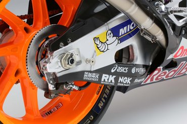 Van még egy apróság, ami nem a tavalyi motorhoz képest új, hanem Márquez és Pedrosa versenygépe között különbség: Pedrosa hátsó féktárcsája szimpla lyuggatott acéltárcsa, míg csapattársáé az utcai motorokhoz szokott szem számára szokatlan, belső hűtésű. Erre egyszerű a magyarázat, Márquez sokkal többet fékez lábbal.