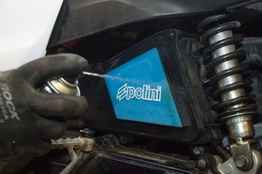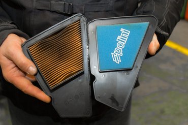 A kerékcserénél ránéztünk az első kerékcsapágyakra, amikből szintén újra volt szükség, így viszont megint tökéletesen egyben van. És hogy ne csak karbantartás legyen, egy kísérletet teszünk az utángyártott Polini légszűrővel - ez a gyáritól eltérően nem papír, hanem szivacsszűrő. Ránézésre kisebb felületen engedi át a levegőt, viszont a szivacs miatt nagyobb a légáteresztő képessége. Egyelőre nem érzek különbséget, de ki tudja. A szivacsszűrő előnye, hogy tisztítható, hátránya, hogy karbantartást igényel: ki kell mosni és újrakenni légszűrőolajjal, hiszen nem a szivacs, hanem beleitatott ragacsos anyag fogja meg a szennyeződést.