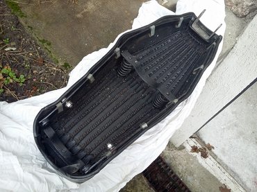 Végül nyeltem egyet, szétszedtem az ülést. A váz kiváló állapotban vészelte át az éveket, annak csak egy festés kellett. Ezen a rugós vázon lakik egy hat gumilapból álló koporsó, ami a formát adja. Azért rogyott be annyira az ülés, mert a koporsó élei, és az ülőlap két gumija közötti varrás helyenként elengedett – el lehet nézni neki ennyit 61 év után. Mi több, a vékony műbőr huzat alatt hajdan szivacsréteg (korabeli szakszóval: laticel) lakott, ami mostanra némi koszos festékfolt formájában lelhető már csak fel a műbőr belső felén.