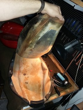 Végül így is alakult: abban az alsó zsákban, amelyikben nincs benzincsap-nyílás, a kelleténél több anyag megült, s láthatóan nem akart megszilárdulni. Hőlégfúvóval melengettem, majd a forró tankot az oldalára borogattam, csak így sikerült végül elteríteni. De azt hiszem, elég jó lett.
