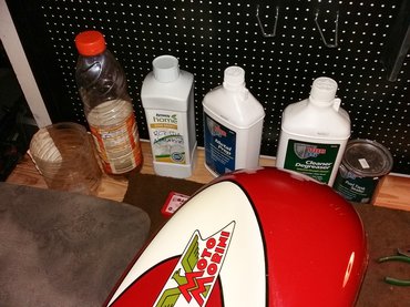 Elkezdtem a procedúrát, amit például Kis Csabi a Ponton tankján anno egy hegesztett, forgatható keret és egy Volga ablaktörlőmotor segítségével végzett el. Benzincsap helyére dugót, tankba sörétet, kisebb-nagyobb csavarokat, rá a speciális a mosószert, ami a szett része, lehetett rázogatni három napon át, pár óránként. Elég lassú és kínos munka, ráadásul a fémek rettenetesen zörögnek a tankban, mindenki frászt kap tőle, de csak így lesz jó.