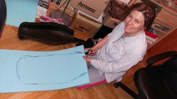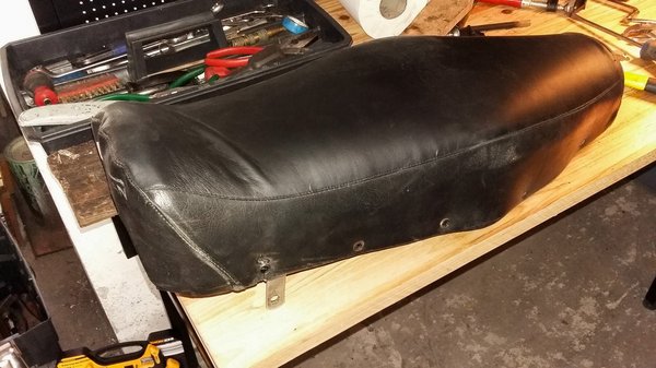 Ezért alakult úgy, hogy szombat éjjel Katival nyeregszivacsot szabtunk, majd ragasztottam a gumi vázra, majd vasárnap reggel az egészet ráfeszegettem az ülésre – de pocsék meló, nem csapok fel kárpitosnak... Iparostanonc-munkának randa lett (mert a régi műbőr egy helyen felszakadt az oldalsó szegecs mellett, a bőr pedig vet egy ferde hurkot a hátsó utas fara alatt), de átmeneti megoldásnak egyszerűen csodás.