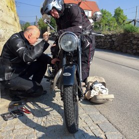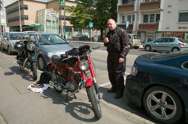 Aztán egyszer csak rendszáma lett a motornak, én meg kitaláltam, hogy akkor a beavató próbája az legyen, hogy kimegyek vele a weissenkircheni veteránmotor- és -kisautó hegyi felfutó versenyre, oda, ahová 1990 óta kvázi minden évben kijárok. Ehhez az ötlethez társnak pedig elhívtam régi gimnáziumi barátomat, Endrét, aki tavaly vett Németországból egy 1951-es gyártású NSU 251 OSL motort. Neki ugyan volt vizsga a motorján, de egy nagyon bácsi-bácsitól vette, aki láthatóan a saját garázsában, saját nem különösen nagy hozzáértésével szerelte a motort. Láthatóan nem voltak vele világhódító tervei, annyira működőképessé tette, hogy legyenek rajta gumik (azok újak!), fékek, világítás és fényezés, kicsit lekente kályhaezüsttel egyik-másik krómot, de a lígő-lógó vezetékek, szigetelőszalagos megoldások, laza és hosszúra hagyott bovdenek, ezer egyéb arra utalt, hogy legfeljebb a szomszéd falu oda-vissza távon gondolkozott a motorral.