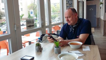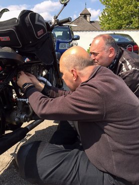 Még csak tizenegy volt, de megint alaposan áthűltünk, ráadásul én szerelvényt akartam igazítani. Egy á la carte étterem előtt letámasztottuk a gépeket, én előbányásztam a szerszámos csomagot, hengerfejet húztam, mert az olajnyomokból és a sziszegésből azt gyanítottam, kompressziót veszítek. Lehetett rajta tekerni, ez tény, de egy új tömítés talán többet tett volna. Mindenesetre meglett a sziszegés forrása is – a kipufogó hollandere lelazult. Azt is visszatekertem, mehetünk be.