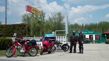Mivel még korán volt és Lacus barátunkkal (aki egy sokkal újabb és gyorsabb motorral, egy velünk párhuzamos, de olajozottabb működésű univerzumban haladt Weissenkirchen felé) későbbre beszéltünk meg találkát egy ebéd mellett, ezért csak egy gyors levest ettünk, majd szedtük a sátorfánkat és nyeregbe pattantunk. Mindkét motor pöcc-röff, én el is hajtottam, mert fogyott az idő, el kellett érnünk még a szállást, s csak az út egyharmadán voltunk túl. Endre nem jött. Ki nem találják, megint leállt az a dög. Aztán rúgásra csak egy füstpamacs hagyta el a kipufogót, második rúgásra meg egy másik a karburátort. Aztán lehetett verejtékezni. Nem hinném, hogy Endre az NSU-val mind szorosabbra fűződő barátságának vízióját erősítette a fejében azokban a percekben...