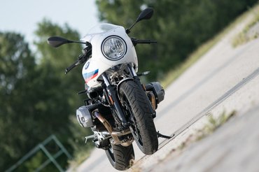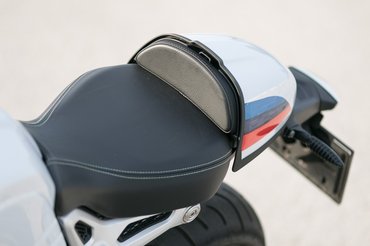 Egy töltény hegyét formázó fejidom, csutkakormány, üléspúp - rendes segédváz sincs, csak egy kis váznyúlvány tartja a nyerget, ennél egyszemélyesebb nem is lehetne. A café racerség jegyében a lábtartót is hátrébb tették egy arasszal az alap nineT-hez képest, ami bölcs húzás, ettől lett ugyanis értelmezhető a szándék, nem pedig olyan hát így adta ki hatású szerencsétlenkedés, mint a Sportster R-nél vagy Yamaha XV950 Racernél.
