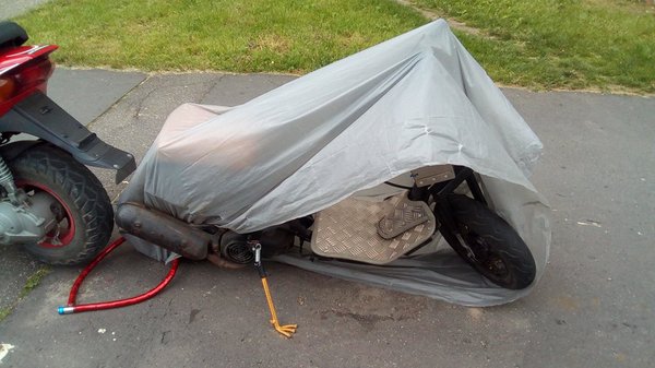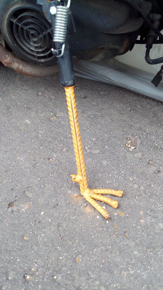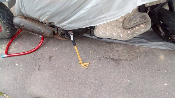 ZSE-NI-Á-LIS! Sajnos a pontos környezetet - bocsánat, művészetről van szó, szóval a kontextust - festőfólia rejti, de ha jól látom, egy komplett patkány-custom-remekműhöz tartozik. És ha belefér egy büntető szóvicc: a ponyva alól kilóg a csirkeláb.