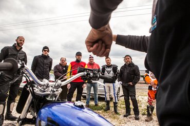 Az olasz suli első magyar tanulóbrigádja erősen vegyes összetételű, ex-pályaversenyzőtől a motorépítőn át az ügyvédig, ez a felszerelésünkön is látszott. Én a krosszos cuccaimat hoztam magammal, de krosszcsizma helyett gyorsasági csizmát javasolt a mester. A salakmotorokhoz képest alapvető különbség, hogy a motorok szériagépekből vannak átalakítva. Ezáltal van váltó és fék is. Az iskola SR400-as Yamahákat használ, amiket a milánói Deus műhelyben kusztomizáltak. Kinézni is stílusosan kell ugyebár, nemcsak keresztbe menni.