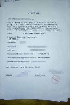 Felkeresett egy Kawasaki márkaszervizt, amellyel két éve én is beszéltem és ők pedig ugyanazt vitték végig, amit nekem telefonon elmeséltek: megrendelték a fojtáshoz szükséges gázhatárolót, amely egy apró fémdarab a német Alpha Techninktől. Az alkatrész Sándor szerint jó ha egy eurót ér, a lényeg a hozzá küldött sárga TÜV-füzet. Az alkatrészt elve a motor alvázszámát leadva kell megrendelni, ami a dokumentáció minden oldalán ott van alnyomatban - tehát a papír nem típusra, hanem konkrét példányra szól. Ára 45 ezer forint volt, amire jött még négyezer forint munkadíj. Emellett a szerviz kiállított egy beépítési igazolást, rendelt egy új vázmatricát, illetve adott egy munkalapot.