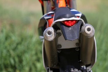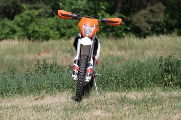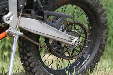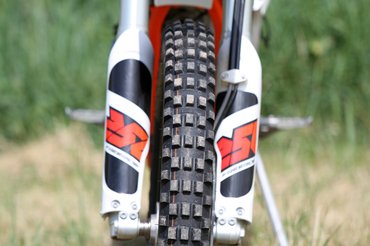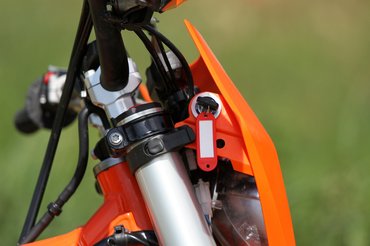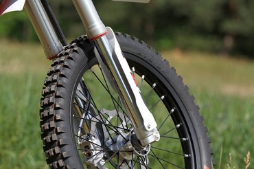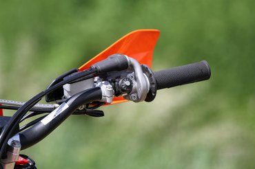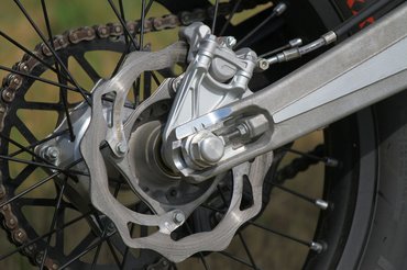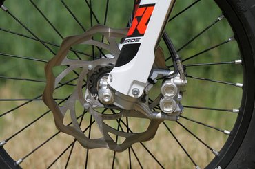 A négycsavaros féktárcsák jelzik, hogy ezek a 85 SX-ről, a KTM gyerek krosszmotorjáról érkeznek, de nem kell lesajnálni őket. Elöl négy, hátul kétdugattyús nyereg lassít, és a kuplunghoz hasonlóan ez is egyujjas, nagyon pontosan adagolható minden. A triálgumikkal laza talajon is közel olyan féktávot lehet venni, mint utcai motorral aszfalton.