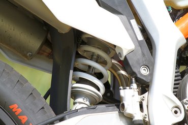 A hátsó WP Xplor rugóstag közvetlenül a lengővillához csatlakozik, az új gátlóval majdnem fél kilót fogtak a rugózatlan tömegen. Mivel nincs himbarendszer, a motor alján sincs semmi, ami fennakadna, ha valaki rönkökön hajtana keresztül. Az első villa minden paraméterében állítható, hátul pedig még a gyors és a lassú csillapítás is külön csavart kapott.