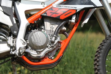 A kétütemű Freeride 250R-t és a négyütemű Freeride 350-et egyaránt elkaszálták, és helyettük lett ez, a négyütemű Freeride 250F, a negyedliteres EXC-F versenyenduró átdolgozott blokkjával. Más a főtengely, más a vezérlés - az eredmény 20,5 lóerő és 18 Nm, de egy szoftverfrissítéssel 26 lóerősre és 22 Nm-re izmosítható - ezt a tesztmotornál meglépték, és ettől nem csak erősebb, hanem úgy általában közvetlenebb és élettel telibb lett.