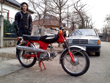 Aztán a Sádi, akit a szülei amúgy tiltanak a motorozástól, sportmotor-őrült lett jó pár évvel ezelőtt. Mire a Bendegúz, akinek a legengedékenyebbek a szülei, gyorsan beújított egy 125-ös Sachsot az apjával közösbe'. Ekkor Bálint is elérkezettnek látta az időt, hogy lépjen – tavasszal elkezdett spórolni egy saját motorra. Volt már ennek némi előzménye, mert amióta hazavittem a Honda SS50-est, s egyszer megengedtem neki, hogy hétvégén, szigorúan a ház előtt menjen vele kicsit fel-alá, azóta állandóan azzal nyaggat, hogy mikor motorozhat megint. De az SS elég hangos, az egyik túlérzékeny szomszéd néni már így is ki akarta ránk hívni a rendőröket, én meg nem akartam balhét. Letiltottam a motorról, azóta csak álmodozik és spórol. Először jöttek a Simsonok (S50/51/Schwalbe vegyesen), aztán a mindenféle ismeretlen fantasztaságok, de akkor még gőze se volt, mennyi pénze tud összejönni, tehát a körvonalak enyhén szólva is képlékenyek maradtak. Annyit biztosan tudott, hogy robogó nem lesz (azaz ha annyi pénzért lenne egy Yamaha BWS vagy esetleg egy Vespa – brrr –, az talán, de a többi ciki), chopper nem lesz, enduró nem lesz. Motorszerű motort akart, helyből. Gőzerővel próbáltam rábeszélni a leglogikusabb választásra, a robogóra, de nem akarja. Titokban örülök neki – az én vérem.