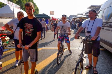 Összeakadtunk a Csabival, aki hozta lefelé a gyönyörűséges faro bassa Vespát. 1960-as motor, san marinói, tulajtól, minden papírjával, nagyjából készre restaurált, csak apró részletek hiányoznak még – rozsdásak a kerékcsavarok, lyukas a kipufogókönyök. Különben a lemezmunka tökéletes, a fény, az ülés hibátlan, mechanikailag teljesen pöpec. Letessékeltem a gépről, szúrtam egy egyest, hű de finom. kettő, a váltó is sokkal jobb, mint a későbbieken, három, de nyomatékos ez a motor!, aztán sípolás, ennyit tudtam meg az utolsó alsó fényszórós 125-ösről. Azaz a féket is kipróbáltam. Itt ütköztem bele Imola egyik nagy, mostanában körvonalazódó problémájába – valahogy kevés a látogató. Eddig, ha nem is háborítatlanul, de azért pianóban mindig lehetett pöfögni a motorokkal, mert a sok ember között elveszett a kevés pályaőr. Most viszont ugyanannyi van belőlük, s messzire ellátnak, meg is állítanak mindenkit, aki motorozni mer. Mi történt itt?