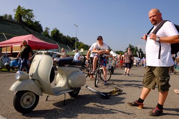 A pizzériába beszéltük meg a találkát a magyar kontingens másik szálával, Szilágyi Csabival és Csereklyei Danival is, akikkel tavaly egy furgonban tettük meg majdnem ugyanezt az utat. Ők akkor már egy napja kint voltak, Csabi a pénteki napon már beújított két Vespát, amelyek közül az egyik egy régi, lenti lámpás (faro basso) modell volt. Igazi Római vakáció-, Audrey Hepburn-, Gregory Peck-cucc; ha létezik időutazás, biztosan jobb kellék hozzá, mint egy DeLorean DMC-12.