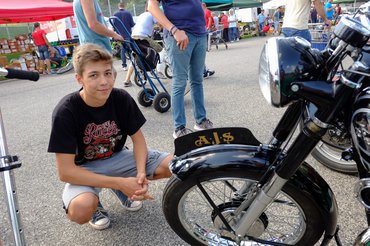 Ősrégi, koporsótankos, szalonnaszeletelő lendkerekes, csitti-fitti Moto Guzzik végtelen sora húzódott bal oldalon. Oppáré, egy restaurátor csapat standja, csúcsszintű cuccok, ezekre ránézni sem igen szabad, mert az is pénzbe kerül. De hopp és nicsak, ott egy angol twin a sor végén. Egy AJS. Épp az a márka, ami miatt elkezdtek érdekelni a nagymotorok. Persze, ez nem a külső szelepes, pufogós fajta, mint amit 1998 táján, Weissenkirchenben láttam elhúzni a hegyen, hanem már a háború utáni korszakból származik, amikor a Matchless megvette az AJS-t és létrejött az AMC, de akkor is. Egy AJS. És egy twin, azaz sorkettes. Gyönyörű. Elegáns. Fekete és króm, s mind hibátlanul. A vágyaim találkozópontja. Egy Tuxedo Junction.