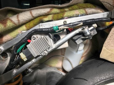 Elmesélem hátulról kezdve, a futóművet is onnan kezdtük. Szóval visszamegy az ECU. Szépen megtisztítva, gumibakon ágyazva. Erre felpattan a HRC box, ami azt hivatott szolgálni, hogy a leszedett cuccok visszajelzői ne csináljanak balhét, és a tiltás a felső három fokozatban ne lépjen életbe. Okosan ki vannak cserélve rajta a csatlakozók olyanra, hogy csak a gyári versenykötegre lehessen csatlakoztatni. Itt jön rögtön két dolog, amit nem tudtam, hogy szükségem lesz-e rá. Az egyik az akksi, a másik a feszültségszabályzó a töltéshez.