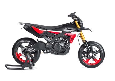 A Rotobox karbon felnik alapnak tekinthetők, ha már a cég ezzel foglalkozik, a fék elemeit a Brembótol szerezték be, a 320 milliméteres T-Drive első tárcsába pedig GP4RR féknyereg mar. Az első villa egy Öhlins FG461, hátra pedig TTX Flow rugóstag került - mind a kettő alapvetően krosszosoknak gyártott cucc, amelyeket áthangoltak, hogy ideálisak legyenek szupermotózáshoz.
