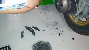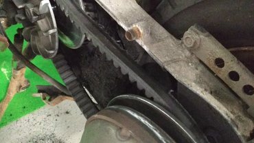 Nem bírtam sokáig, hoztam be szerszámokat, szétszedtem a Honda-dögöt, levettem a bal deknit. Juj, de fura ez a szíj... Hosszában van rajta egy rettentő érdekes bemaródás, mint valami nút. De nem szakadt el, körbemegy. Hogyafene... Egy rakás, valaha valami kör alakú tárgyhoz tartozó alumíniumtörmelék hullott a földre, néhány egészen nagy darab is.