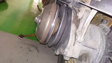 Hazavittem a maradékokat, otthon, a ládányi Spacy-alkatrészben turkálni kezdtem a pótlást. Egy jó szíjat találtam, és hopp, volt ott egy maradék kuplungszerkezet is, szíjtárcsával! Igen ám, de ezt az egész szerkezetet egy nagy rugó nyomja kifelé, a rögzítés ellenében, és akárhogy próbáltam satuban összenyomni, nem fért bele, vagy ha igen, a szerszám nem fért oda. Nem én fogom szétszedni.