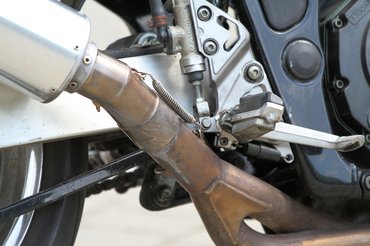 Az 1200-as Bandit karbijai gyárilag 36-osak, az enyémen viszont 40-esek vannak, nyitott a légszűrőház is és egy elég minőségi, komplett kipufogórendszerrel vettem. A német Schüle kevéssé ismert cég, a hetvenes években kezdtek kipufogókat gyártani NSU versenymotorokra, mert észrevették, hogy azoknál jó eredményeket lehet elérni a kipufogó módosításával. A nyolcvanas években már elég komoly projektekbe tudtak belenyúlni, azóta pedig építettek már komplett rendszert 1937-es BMW 328 alá, kínálnak csöveket Wankel motoros gokartokhoz, klasszikus típusokhoz, pl. CBX1000-hez, illetve féltett ritkaságokhoz is. Ez én kipufogóm is szép darab, ráadásul papíros és halk. Viszont nagyon éreztem rajta, hogy a motor gázlengésének teljes útja szét lett zilálva. Az egykori német tulaj tuningolni akart, de nagyon bement az erdőbe, valószínűleg ezért is adta el.
