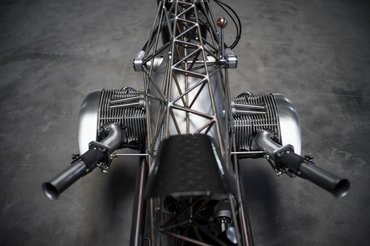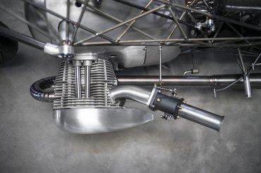 A Revival Birdcage öt hónapig készült, és szinte csak egy hatalmas blokk és két kerék, a váz pedig egy vékony titáncsövekből hegesztett, elképesztő térhálós váz - ennél jobban egyszerűen nem lehet kiemelni a léghűtéses bokszert. A blokk érdekessége, hogy teljesen máshogy néz ki, mint amit a legutóbbi tanulmányban láthattunk, a paraméterei változatlanok. A mostani kiadás a szálcsiszolt domború felületeivel a hatvanas évek bokszereit idézi.