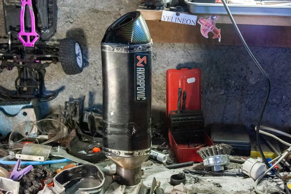 Meglepően jól lemásolták az eredeti Akrapovic kipufogó méreteit és arányait, inkább az összeszerelés minősége problémás. A hegesztésekkel spóroltak, az illesztések se nagyon passzolnak, és az anyag sem olyan vastag, mint az eredeti Akrapovicoknál. Mivel jók az arányok és a méretek, így akár még némi teljesítménynövekedést is okozhatna nagy fordulaton, de szakember legyen a talpán, aki ezt észreveszi menet közben. Az egyetlen gond, hogy járó motornál, orrán-száján ömlik belőle a kipufogógáz, ami máris elrontja az arányokat.