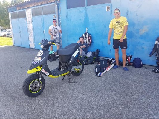 Karesz, a rendkívül higgadt és megfontolt. A 2017-es TB24-en ült először robogón, tavaly másodjára. A motor vásárlásánál jelen volt, de elveivel szembementünk, megvettük a lista elejéről a legolcsóbbat (mondjuk az egyetlen volt). Tempója és technikája stabilan felfelé ível. Évről évre, körről körre gyorsabb, így kihagyhatatlan versenyző. Életét kockáztatta a csapatért a nevezésnél, mert reggeli hiányában el sem mert mozdulni a gép elől.