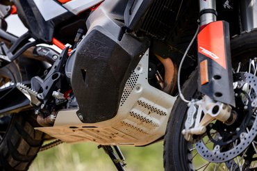 Ennek érdekében a tankot mindkét oldalon mélyre vitték, mint egy ralimotornál. Oldalra tettek egy-egy műanyag védőelemet, de állítólag az csak az érdeklődők megnyugtatását szolgálja, anélkül sem lyukad ki, még egy nagyobb takarózásnál sem. Utóbbit meg tudom erősíteni, ugyanis a terepes szakaszt egy látványos eséssel zártam, ami során a motor többször átfordult, lényegében ép porcikája sem maradt, de a tank tényleg nem lyukadt ki.
