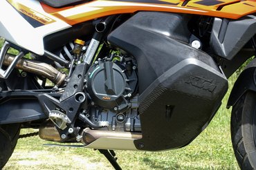 A soros kéthengerest a 790 Duke-hoz képest áthangolták, az Adventure-ben 95 lóerőt (8000-nél) és 89 Nm-t (6600-nál) tud, és egészen 7000-ig mindenhol nyomatékosabb, mint a naked változat, a Duke plusz tíz lóereje igazából csak 8000-es fordulat felett érvényesül. Bár a két henger párhuzamosan áll egymás mellett, a hajtókarokat elékelték 75 fokkal, így 435 fokonként van gyújtás, éppen úgy, mint egy V2-esnél - ennek nem csak a hang miatt van jelentősége, nem véletlen, hogy a BMW-től a Yamaháig mindenki átállt erre. Igazából nem is az egyenletesebb nyomatékleadás miatt szeretik, hanem a külön mozgó dugattyúkkal rengeteg súlyt lehet lefaragni, könnyebb lehet a főtengely, kisebb kiegyenlítősúlyokra van szükség.