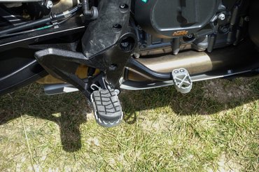 Az alapváltozat sem lehangoló, pedig ez már közel sem az a szint, mint tíz éve, amikor a KTM egyszerűen presztízskérdést csinált abból, hogy a legjobb beszállítókkal dolgozzon együtt. A fontos dolgokra viszont adtak, például már az alapváltozat is terepképes, ami nem csak azt jelenti, hogy van 20 centi rugóútja, és elöl 21-es, hátul 18-as gumikon gurul, mint egy rendes enduró, hanem olyankora is figyeltek, hogy az idomok anyagukban színezettek legyenek, így egy kis csúszás után sem fog nagyon hajléktalanul kinézni. A széles, fogazott lábtartókra és fékpedálra rá is kérdeztem, hogy ezek ugye a Powerparts katalógusból származó, feláras darabok, de a gyári emberek legyintettek: nem, szériában ezzel jön.