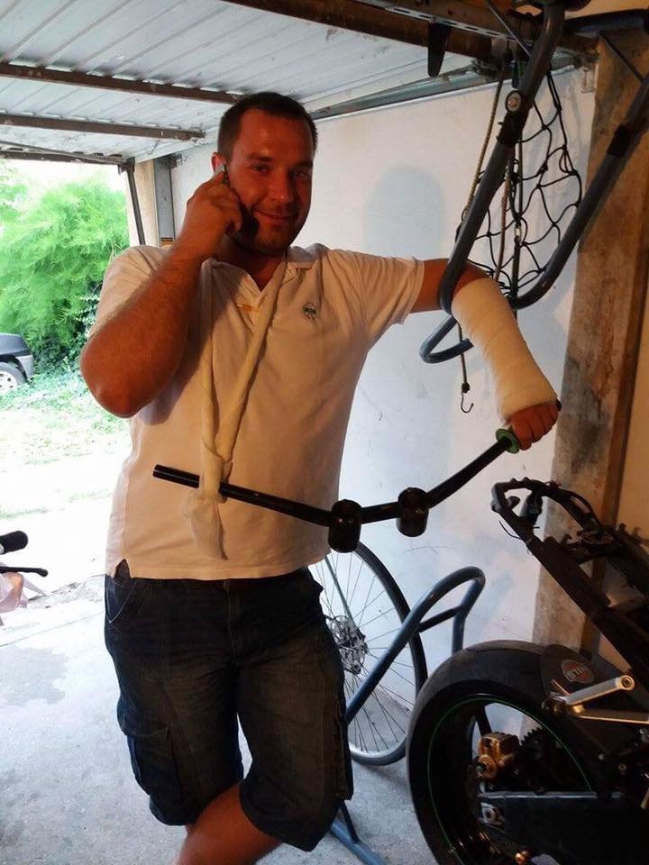 Szokásos story: először Szimó, majd jött az Emzé. Innentől nem volt megállás. Az MZ-t megépítette stunt motornak, és már mehetett is az egykerekezés. Jelenleg egy CBR 954-et hajt. Mint a kép is bizonyítja, a motorozás jobban megy neki, mint a biciklizés.