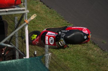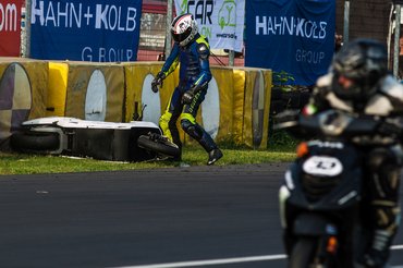 A 4 pasi meg egy kicsi egyik versenyzője bukott, előreláthatólag még 5 percig nem indulhat újra a futam. A versenyző állítólag a saját lábán ment oda a mentőhöz.