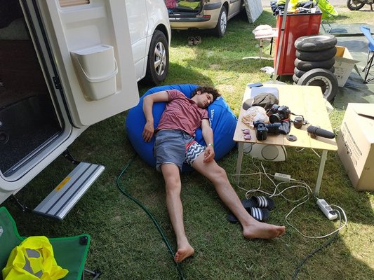 Mondják, hogy a verseny fejben dől el, pilótánk, Filep Tomi viszont fizikailag dőlt ki egy kis pihenőre. A kép elkészülte óta egyébként már ismét humanoidnak néz ki.