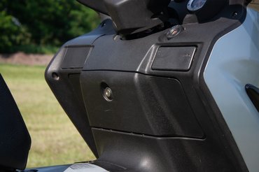 És ha már sötét van, a tároló is kapott egy kis lámpát, hogy éjszaka is minden meglegyen az ülés alatt. Kicsit sajnálom, hogy ez csak akkor megy, amikor gyújtás van a motoron. A tároló ugyanúgy hatalmas, sőt még nőtt az elődhöz képest, és most már tényleg elfér benne két sisak. Megsüllyesztették az első tárolórészt, csak a porlasztó kapott magának egy üreget, de a sisaknak ez pont nem gond. Dobozzal kiegészítve mindenre elég a csomagtér, ami egy túrához kellhet.