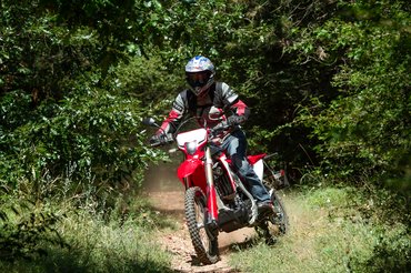 Egy ilyen futóművet viszont drága összerakni, és az ár sem garancia arra, hogy jó lesz, például így járt a Husqvarna 701 Enduro (nem sokkal drágább, de háromszor erősebb), amibe nagyon jó minőségű villát is rugóstagot tettek, aztán terepre érve minden eszembe jutott, csak az élvezet nem. A CRF450L-nél külön érdekes, hogy utcán sem érződik lágynak, mint a hobbiendurók, amik minden fekvőrendőrt és kátyút vízágyként kihintáznak, hanem ha elkapsz egy keresztbordát, az ülés továbbítja az információt a fenéknek – csak kicsivel puhábban, mint egy kétcollos tölgyfa palló.