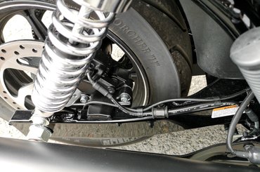 53 ló@8000, ez tényleg már a postás-MZ kategória. A Suzuki Gladius szintén vizes V2-ese 10 éve 650 köbcentivel volt 75 ló, de nem is a számai miatt volt jó, hanem mert egy erős motornak éreztem. Amivel jó volt menni, még akkor is, ha tudtam, hogy néz ki, és miből van a nagy része. A Street 750 viszont gyenge, a blokk nem rázkódik, nem harákol, semmi harleysat nem csinál. Bármi lehetne. De tényleg nagyon széles értelemben vett bármi, leszámítva értelemszerűen a Harleyt, mert az nem. A fogazottszíj-hajtás ugyanakkor Harley-dolog, csak hát érzésre azt nem érezni, látványelemként is csak akkor van meg, ha odanyomjuk a fejünket a nyereghez, és bekukucskálunk. Akkor meg muszáj lesz ránéznünk az iszonyatosan igénytelen lengővillára.