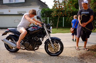 De a lényeg – Kati is vett egy motort. A magyar piac legolcsóbb Ducati Monsterét, talán 420 ezerbe került. Ezért persze volt baja. Eleve a régi, karbis, gyenge 600-as, amellyel el is estek. A tulaj kiszeretett a motorozásból a potty után, a szerelőjére bízta, hogy azonnal adja el, mi onnan, a kis tatai szervizből vettük meg. Törött fényszóró, horpadt tank, görbe szektorok és kormány, ütő első felni, törött index és tükör – ezek voltak a nyomok. De ennek is előtte volt szíjcseréje, szelepállítása, a gumik szinte újak, a láncszett hibátlan, a pocsolyán áttolva, a nyomok szerint egyenesen megy (érzetre is), a váz jó, az ülés ép, az elektromosság megy, indul, húz, klassz. Kati szomorkodott, hogy nagyon fekete, ő színeset jobban szeretett volna, de az ár tényleg pompás volt. Hát elhoztuk, azaz elhoztam. Nekem kicsit gatyának tűnt, de ez nem egy SS, hanem egy Monster, ráadásul ketten ültünk rajta Bálinttal hazáig. Az íze jó, finom, röfög, harap. Ducati.