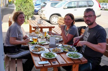 Az út további részén Kati nagyon összeszedte magát. Nem következett be amitől féltem, mármint hogy a riadtság miatt megutálja a motorozást, sőt, újra erőre kapott, szinte tolt, hogy menjek bátrabban, hiszen nem tötymörögni jöttünk, hanem élvezni az utat. Bátrakra mosolyog a szerencse, mert egy olyan döbbenetesen jó görög éttermet találtunk (hol másutt, mind Leobenből kihajtva, a préri szélén, az országút mellett), hogy legszívesebben két, komplett ebédet beburkoltunk volna.