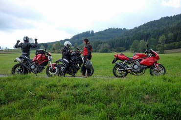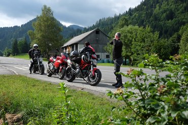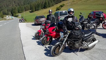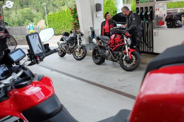 Meg is álltunk kávézni, ellenőrizni mobilon át, mit művelnek otthon a kölkök, egy Apfelstrudel is lecsúszott, otthonos volt a hely, na. Kicsit elnehezülve pattantunk nyeregbe, de a paripák is enni kértek, pár száz méterrel odébb gyorstankolás, közben mindenfelé Ducatik, nem a mieink. Oké, nem vagyunk egyedül ezzel a Ducati-vonzalommal, kicsit jobb.