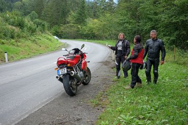 Már jól bent jártunk a Wildalpenben, amikor egyszer csak egy inkább panaszos, mint ijedt megjegyzés érkezett az intercomon át – „jaj, ezt elszúrtam, a francba, ááá...” Persze azonnal a tükörbe pillantottam és azt láttam, ahogy a Kati egy nyugis, hosszú jobbos ív közepéről egyenesen átszeli az utat, leveri egy útjelző oszlop tetejét, majd elegánsan eldől. A Ducatim fordulóköre egy teljes létszámmal repülő Airbus A380-aséval vetekszik, ezért beletelt egy időbe, mire visszamotoroztam a helyszínre. Addigra Lacus felesége, Piros és Kati együtt próbálták felemelni a Monstert a földről, mert megijedtek, hogy csöpög belőle valami. Karburátoros motor, az úszóból ilyenkor mindig kifolyik a tartalom, de utána eláll, mert a benzincsap vákuumos, és ha nem megy a motor, az se nyit. Don«t worry.