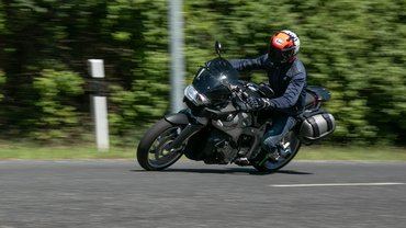 Alapból enyhén farnehéz, 49-51 az eloszlás az első és a hátsó tengely között - ennek inkább a fordítottja az ideális, vagyis a leheletnyi orrnehézség a kívánatos egy sportos utcai motornál - és ezt a balanszot épp a vezető súlya állítja be. Az üléspozíció jó átmenet a csapatós és a kényelmes között, a térdszög lazán sportos, a felsőtest enyhén előredől, a kormány mondjuk szerintem feleslegesen széles, de ebben a pózban egyszerre lehet aktívan kanyarogni és autópályán hasítani.